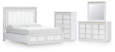 Chalanna California King Upholstered Storage Bed with Mirrored Dresser and Chest