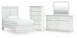 Details | B139B41: Includes panel headboard/footboard and rails, Made with engineered wood (MDF/particleboard/plywood) and decorative laminate for the right balance of affordability and durability, Replicated solid white paint, Decorative laminate replicates natural or man-made material surfaces with consistent color, pattern and texture, Foundation/box spring required, sold separately, Mattress available, sold separately, Assembly required, B139B40: Includes dresser and mirror, Made of engineered wood (MDF/particleboard), Knobs with pewter-tone finish, Scalloped moulding, 6 smooth-operating drawers, Includes tipover restraint device, Mirror attaches to back of dresser; can also be mounted on wall horizontally or vertically, Safety is a top priority, clothing storage units are designed to meet the most current standard for stability, ASTM F 2057 (ASTM International), Drawers extend out to accommodate maximum access to drawer interior while maintaining safety, B139-46: Made of engineered wood (MDF/particleboard), Pewter-tone knobs, Scalloped moulding, 5 smooth-operating drawers, Small Space Solution, Includes tipover restraint device, Safety is a top priority, clothing storage units are designed to meet the most current standard for stability, ASTM F 2057 (ASTM International), Drawers extend out to accommodate maximum access to drawer interior while maintaining safety, | |