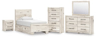 Details B2310B23: Includes panel headboard, panel footboard, 2 under bed storage units and roll slats , Made with engineered wood (MDF/particleboard/plywood) and decorative laminate for the right balance of affordability and durability, Rustic white finish over replicated reclaimed oak grain with authentic touch, Decorative laminate replicates natural or man-made material surfaces with consistent color, pattern and texture, 4 smooth-gliding storage drawers, Drawer interiors are lined with a faux linen laminate for a clean, finished look, Handles with dark pewter-tone finish, Bed does not require additional foundation/box spring; accommodates most zero clearance adjustable bases with the addition of a bunkie board , Mattress available, sold separately, Minor assembly required, B2310B1: Made with engineered wood (MDF/particleboard/plywood) and decorative laminate for the right balance of affordability and durability, Rustic white finish over replicated reclaimed oak grain with authentic touch, Decorative laminate replicates natural or man-made material surfaces with consistent color, pattern and texture, Handles with dark pewter-tone finish, 6 smooth-gliding drawers, Drawer interiors are lined with a faux linen laminate for a clean, finished look, Framed front and pilasters, Safety is a top priority, clothing storage units are designed to meet the most current standard for stability, ASTM F 2057 (ASTM International), Drawers extend out to accommodate maximum access to drawer interior while maintaining safety, Mirror attaches to back of dresser; can also be mounted on wall horizontally or vertically , Minor assembly required, B2310-46: Made with engineered wood (MDF/particleboard/plywood) and decorative laminate for the right balance of affordability and durability, Rustic white finish over replicated reclaimed oak grain with authentic touch, Decorative laminate replicates natural or man-made material surfaces with consistent color, pattern and texture, Handles with dark pewter-tone finish, 5 smooth-gliding drawers, Drawer interiors are lined with a faux linen laminate for a clean, finished look, Framed front and pilasters, Safety is a top priority, clothing storage units are designed to meet the most current standard for stability, ASTM F 2057 (ASTM International), Drawers extend out to accommodate maximum access to drawer interior while maintaining safety, Minor assembly required, B2310-92: Made with engineered wood (MDF/particleboard/plywood) and decorative laminate for the right balance of affordability and durability, Rustic white finish over replicated reclaimed oak grain with authentic touch, Decorative laminate replicates natural or man-made material surfaces with consistent color, pattern and texture, Handles with dark pewter-tone finish, 2 smooth-gliding drawers, Drawer interiors are lined with a faux linen laminate for a clean, finished look, Framed front and pilasters, 2 slim-profile USB charging ports, Power cord included; UL Listed, Minor assembly required,