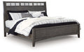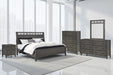 Details | Includes queen panel headboard, rails and footboard with slats , Made with hardwood solids and MDF substrates, Medium gray-brown finish with a blackened wood grain contrast; embossed wood grain texture, Lay-back headboard , Decorative inset metal grille with matte black finish , Foundation/box spring required, sold separately, Mattress not included, sold separately, Assembly required | |