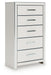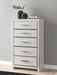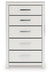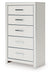 Details | Made with engineered wood (MDF/particleboard/plywood) and decorative laminate for the right balance of affordability and durability, Matte white finish with subtle replicated wood grain, Decorative laminate replicates natural or man-made material surfaces with consistent color, pattern and texture, Chrome-tone accents, Large-scale chrome-tone handles with faceted details, 5 smooth-gliding drawers, Drawer interiors are lined with a faux linen laminate for a clean, finished look, Safety is a top priority, clothing storage units are designed to meet the most current standard for stability, ASTM F 2057 (ASTM International), Drawers extend out to accommodate maximum access to drawer interior while maintaining safety, Minor assembly required | |