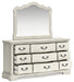 Details Includes dresser and mirror, Made with hardwood solids, spruce veneer, MDF substrates and cast resin components, Antiqued white painted finish, 9 drawers with fully finished interiors, French and English dovetail construction and ball-bearing side glides, Metal bar pulls with aged pewter-tone finish, Mirror attaches to back of dresser