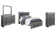 Details | B214-46: Made of engineered wood (MDF/particleboard) and decorative laminate, Gray finish with replicated wood grain, Faceted chrome-tone pulls and accents, 5 smooth-operating drawers, Drawer interiors are lined with a faux linen laminate for a clean, finished look, Safety is a top priority, clothing storage units are designed to meet the most current standard for stability, ASTM F 2057 (ASTM International), Drawers extend out to accommodate maximum access to drawer interior while maintaining safety, B214B1: Made of engineered wood (MDF/particleboard) and decorative laminate, Gray finish with replicated wood grain, Faceted chrome-tone pulls and accents, 6 smooth-operating drawers, Drawers lined with faux linen laminate, Mirror attaches to back of dresser, Includes tipover restraint device, Assembly required, B214B3: Includes headboard, footboard and side rails, Made of engineered wood (MDF/particleboard) and decorative laminate, Gray finish with replicated wood grain, Faux leather upholstery, Faux crystal and faceted chrome-tone metal accents, Accent LED lights with remote to control color and brightness, 2 smooth operating drawers, Power cord included; UL Listed, Small Space Solution, Foundation/box spring required, sold separately, Mattress available, sold separately, Assembly required, Bed is not compatible with an adjustable base, | |