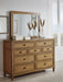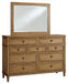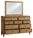 Details B895B2: Includes upholstered panel headboard, footboard, rails and slats, Made with hardwood solids, hickory veneer and MDF substrates, Light brown wood-tone finish, Polyester upholstery, Foundation/box spring required, sold separately, Mattress available, sold separately, Assembly required, B895B1: Includes dresser and mirror, Made with hardwood solids, hickory wood veneer and MDF substrates, Light brown wood-tone finish, Dark bronze-tone drawer pulls, 9 drawers with fully finished interior, dovetail construction and heavy duty ball-bearing side glides (top drawers felt lined), Mirror attaches to back of dresser,