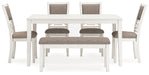 Details | Includes dining table, 4 chairs and bench, Table made with rubberwood solids, mindi veneer and MDF substrates, Chair and bench made with solid wood frame and engineered wood, White finish, Light gray textured polyester upholstery, Foam seat and back cushions, Chair with adjustable levelers; backrest with fretwork accent, Tapered legs, Seats up to 6, Assembly required | |