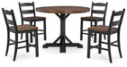 Details D546D21: Includes dining table top and base, Made with pine solids, pine veneer and engineered wood substrate, Rustic black finish on base, Rustic brown finish on tabletop, Sturdy post and bracket base design, Assembly required, D546-724: Made with hardwood solids, Distressed black frame, Solid pine seat with rustic brown finish, Contoured seat for comfort, Front legs with adjustable levelers, Assembly required,