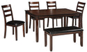 Details | Includes table, 4 upholstered chairs and upholstered bench, Table made of veneers, wood and engineered wood, Wood frame chairs and bench, Cushioned seats with faux leather upholstery, Seats 6, Assembly required, Expert assembly recommended; available at check out for an additional fee | |