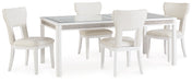 Details | D822-35: Made with solid wood components, MDF substrate and decorative PVC laminate, Bright white lacquer finish, Tabletops feature rhinestone and textured PVC framing with glass panels, Rhinestone accent trim, Seats up to 10, Removable center leaf, Table extends by pulling both ends and dropping in leaf, Assembly required, D822-01: Made with solid wood frame, Bright white lacquer finish, Polyester upholstery, Foam cushion, Legs with adjustable levelers, Assembly required, | |