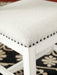 Details D546-35: Made of pine wood, veneer and engineered wood, Two-tone finish, Black metal accents, Table extends by pulling both ends and dropping in leaf, Seats up to 8 fully extended, Assembly required, D546-01: Made of solid wood, Distressed vintage white finish with linen colored polyester upholstery, Nailhead trim, Cushioned seat, Assembly required,