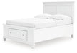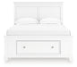 Details | Includes panel headboard, storage footboard, rails and roll slats , Made with hardwood solids and MDF substrate, Side rails feature laminated solid hardwood slat support rails (or LVL) with glued and screwed blocking for added strength , White painted finish, Round metal drawer knobs with satin nickel-tone finish, Tapered feet, 2 smooth-gliding drawers in footboard , Bed does not require additional foundation/box spring; accommodates most zero clearance adjustable bases with the addition of a bunkie board , Mattress available, sold separately, Assembly required | |
