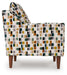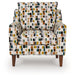 Looking for a statement piece that's both stylish and comfortable? This accent chair delivers with its vibrant multicolor block pattern and plush upholstery. The classic shelter arm styling adds a touch of timeless elegance, while the chair's overall design brings a pop of personality to any room.
