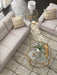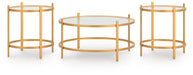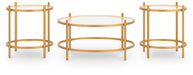 Details | Includes coffee table and 2 end tables, Made with tubular steel frame, Durable metallic goldtone powder coat finish, Inset tempered glass top | |