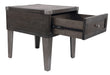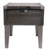 Take a stance for rustic-industrial style with this mixed material end table. Weather-washed pine wood and veneers are contrasted with canted metal legs and corner bracket accents for a uniquely chic merger of earthy beauty and contemporary flair. Power plug-ins and USB charging ports mounted on the back add practical function to great form.