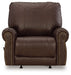 Details | One-pull reclining motion, Corner-blocked frame with metal reinforced seat, Attached back and seat cushions, High-quality foam cushions wrapped in poly fiber, 100% top grain leather covers inside areas such as the back, seat and arm cushions; skillfully matched faux leather covers the remaining areas, Due to its natural origin, real leather can show individual characteristics such as healed scars, growth marks, grain variation and shade variation, Natural variations make each hide unique and do not detract from the wearing qualities of leather, Pigmented corrected grain leather with slight embossing and a light contrast spray effect to add more depth | |