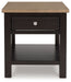 Details Made with acacia solids, acacia veneer and MDF substrate, Tabletop with light wood-tone finish, Dark chocolate brown body, 1 smooth-gliding drawer, Open lower shelf