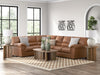 Modern comfort never looked so good. Sporting supremely soft yet durable cushions accented with high-fashion jumbo stitching, this stunning sectional is the ultimate choice in comfortably cool, contemporary style. Its caramel-hued faux leather indulges with an upscale feel and wows like the real thing.