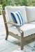 Details Rust-resistant aluminum frame with durable powder coated finish, Powder coated aluminum resists rusting and fading, Wood-look finish, Loose back and seat cushions, All-weather foam cushion core wrapped in soft polyester, Zippered cushions and throw pillows covered in solution-dyed high-performance fabric, Nuvella+ is an outdoor fabric that can be cleaned and offers enhanced UV resistance, Clean fabric with mild soap and water, let air dry; for stubborn stains, use a solution of 4 oz. bleach to 28 oz. water, 2 Nuvella throw pillows included, Stainless steel hardware, Designed to withstand the harsh elements of the outdoors, Assembly required