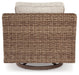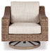 Details All-weather resin wicker handwoven over powder coated rust-proof aluminum frame, Zippered cushions covered in high-performing Nuvella® fabric, All-weather foam cushion core wrapped in soft polyester, 360-degree swivel, Imported fabric and fill, Clean fabric with mild soap and water, let air dry; for stubborn stains, use a solution of 4 oz. bleach to 28 oz. water, Assembly required