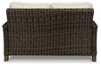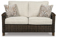 Pretty enough for trendy interiors, yet durable enough to weather the elements, the Paradise Trail outdoor loveseat rises to the challenge beautifully. Handwoven resin wicker over rust-proof aluminum merges high style with low maintenance. Rest assured, though the exposed armrests and feet look remarkably like wood, their sturdy aluminum construction is perfectly suited for alfresco living. Plush seat cushions and throw pillows wrapped in high-performing Nuvella® fabric aim to please.