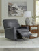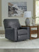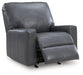 Details Pull tab reclining motion, Gentle rocking motion, Corner-blocked frame, Attached cushions, High-quality foam cushions wrapped in poly fiber, 100% top grain leather covers inside areas such as the back, seat and arm cushions; skillfully matched faux leather covers the remaining areas, Corrected grain leather; two-tone sauvage effect enhances the depth of the color, Due to its natural origin, real leather can show individual characteristics such as healed scars, growth marks, grain variation and shade variation, Natural variations make each hide unique and do not detract from the wearing qualities of leather, Exposed feet with faux wood finish