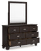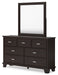 Details | B441B9: Includes panel headboard, footboard, rails and slats, Made with hardwood solids, engineered wood veneer and MDF substrates, Dark brown finish, Floating panel headboard, Picture frame footboard, Foundation/box spring required, sold separately , Mattress available, sold separately, Assembly required, B441B1: Includes dresser and mirror, Made with hardwood solids, engineered wood veneer and MDF substrates, Dark brown finish, Metal bar pulls with bright nickel-tone finish, 7 smooth-gliding drawers with dovetail construction and metal center guides, Drawer interiors are lined with a wood grain laminate for a clean, finished look, Top moulding on dresser, Mirror attaches to back of dresser, B441-92: Made with hardwood solids, engineered wood veneer and MDF substrates, Dark brown finish, Metal bar pulls with bright nickel-tone finish, 2 smooth-gliding drawers with dovetail construction and metal center guides, Drawer interiors are lined with a wood grain laminate for a clean, finished look, Top moulding, | |