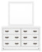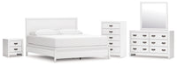 Details | B427B9: Includes California king panel headboard, footboard, rails and slats, Made with hardwood solids, okoume veneer and MDF substrates, White finish, Foundation/box spring required, sold separately, Mattress available, sold separately, Assembly required, B427B1: Includes dresser and mirror, Made with hardwood solids, okoume veneer and MDF substrates, White finish, 6 drawers with dovetail construction and metal center guides, Hardware with dark finish, Drawer interiors are lined with a wood grain laminate for a clean, finished look, Mirror attaches to back of dresser, B427-46: Made with hardwood solids, okoume veneer and MDF substrates, White finish, 5 drawers with dovetail construction and metal center guides, Hardware with dark finish, Drawer interiors are lined with a wood grain laminate for a clean, finished look, B427-92: Made with hardwood solids, okoume veneer and MDF substrates, White finish, 2 drawers with dovetail construction and metal center guides, Hardware with dark finish, Drawer interiors are lined with a clean wood grain laminate for a clean, finished look, | |