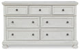 Details | B742B9: Includes headboard, storage footboard and rails with roll slats, Made with select oak veneer, engineered wood, solid wood components and cast resin components, Antiqued white finish with grain texture, Two smooth-gliding drawers with dovetail construction and metal ball bearing side glides, Dark bronze-tone knobs, Bed does not require additional foundation/box spring; accommodates most zero clearance adjustable bases with the addition of a bunkie board, Mattress available, sold separately , Assembly required, B742B1: Includes dresser and mirror, Made with select oak veneer, engineered wood, solid wood components and cast resin components, Antiqued white finish with grain texture, 7 smooth-gliding drawers with dovetail construction and metal ball bearing side glides (pull-out tray and top drawers felt lined), Dark bronze-tone knobs, Mirror attaches to back of dresser, Assembly required, | |