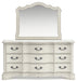 Details B980B5: Includes headboard, footboard and rails, Made with hardwood solids, spruce veneer, MDF substrates and cast resin components , Antiqued white painted finish, Polyester upholstery, Button tufting, Foundation/box spring required, sold separately, Mattress available, sold separately, Assembly required, B980B1: Includes dresser and mirror, Made with hardwood solids, spruce veneer, MDF substrates and cast resin components, Antiqued white painted finish, 9 drawers with fully finished interiors, French and English dovetail construction and ball-bearing side glides, Metal bar pulls with aged pewter-tone finish, Mirror attaches to back of dresser, B980-46: Made with hardwood solids, spruce veneer, MDF substrates and cast resin components, Antiqued white painted finish, 5 drawers with fully finished interiors, French and English dovetail construction and ball-bearing side glides, Metal bar pulls with aged pewter-tone finish,