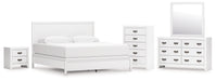 Details | B427B8: Includes king panel headboard, footboard, rails and slats, Made with hardwood solids, okoume veneer and MDF substrates, White finish, Foundation/box spring required, sold separately, Mattress available, sold separately, Assembly required, B427B1: Includes dresser and mirror, Made with hardwood solids, okoume veneer and MDF substrates, White finish, 6 drawers with dovetail construction and metal center guides, Hardware with dark finish, Drawer interiors are lined with a wood grain laminate for a clean, finished look, Mirror attaches to back of dresser, B427-46: Made with hardwood solids, okoume veneer and MDF substrates, White finish, 5 drawers with dovetail construction and metal center guides, Hardware with dark finish, Drawer interiors are lined with a wood grain laminate for a clean, finished look, B427-92: Made with hardwood solids, okoume veneer and MDF substrates, White finish, 2 drawers with dovetail construction and metal center guides, Hardware with dark finish, Drawer interiors are lined with a clean wood grain laminate for a clean, finished look, | |