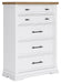 Details | B844B4: Includes panel headboard, storage footboard, rails and roll slats, Footboard made with hardwood solids, MDF substrates and butcher block oak veneer, Headboard and rails made with hardwood solids and MDF substrates, White finish, Headboard with inset black metal barn sash, 2 drawers in footboard with fully finished interior, dovetail construction and ball-bearing side glides, Pulls with matte black finish, Bed does not require a foundation/box spring, Mattress available, sold separately, Assembly required, B844B1: Includes dresser and mirror, Made with hardwood solids, MDF substrates and butcher block oak veneer, Dresser with 2-tone finish (white finish; butcher block oak veneer with natural finish), Pulls with matte black finish, 10 spacious drawers with fully finished interiors (top drawers felt lined), dovetail construction and ball-bearing side glides , Drawers with inset picture fronts, Mirror attaches to back of dresser, B844-46: Made with hardwood solids, MDF substrates and butcher block oak veneer, 2-tone finish (white finish; butcher block oak veneer with natural finish), Pulls with matte black finish, 5 spacious drawers with fully finished interiors (top drawers felt lined), dovetail construction and ball-bearing side glides, Drawers with inset picture frame fronts, B844-93: Made with hardwood solids, MDF substrates and butcher block oak veneer, 2-tone finish (white finish; butcher block oak veneer with natural finish), Pulls with matte black finish, 3 spacious drawers with fully finished interiors (top drawers felt lined), dovetail construction and ball-bearing side glides, 110V power supply with dual USB charging ports, Power cord included; UL Listed, Drawers with inset picture frame fronts, | |