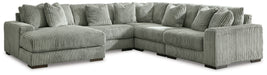 Details | Includes 5 pieces: left-arm facing corner chaise, wedge, 2 armless chairs and right-arm facing corner chair, "Left-arm" and "right-arm" describe the position of the arm when you face the piece, Corner-blocked frame, Reversible cushions, High-resiliency foam cushions wrapped in poly fiber, Throw pillows included, Pillows with feather-fiber blend, Polyester upholstery, Exposed feet with faux wood finish, Platform foundation system resists sagging 3x better than spring system after 20,000 testing cycles by providing more even support, Smooth platform foundation maintains tight, wrinkle-free look without dips or sags that can occur over time with sinuous spring foundations | |