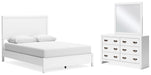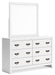 Details | B427B6: Includes queen panel headboard, footboard, rails and slats, Made with hardwood solids, okoume veneer and MDF substrates, White finish, Foundation/box spring required, sold separately, Mattress available, sold separately, Assembly required, B427B1: Includes dresser and mirror, Made with hardwood solids, okoume veneer and MDF substrates, White finish, 6 drawers with dovetail construction and metal center guides, Hardware with dark finish, Drawer interiors are lined with a wood grain laminate for a clean, finished look, Mirror attaches to back of dresser, | |