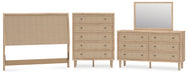 Clean-lined and contemporary—but far from stark—this bedroom package is a fresh style awakening. Pairing a light finish with replicated oak grain and textured beige details that replicate the look of cane, its mixed materials bring a naturally versatile vibe to your bedroom. Sleek, simple hardware plays perfectly with the modern aesthetic.