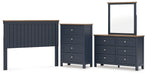 Details | B414-57: Made with hardwood solids, mindi wood veneer and MDF substrates, Two-tone finish features a dark slate blue with a light brown wood-tone top, ¼" bolts (not included) are needed to attach headboard to your existing bed frame, Assembly required, B414B1: Includes dresser and mirror, Made with hardwood solids, mindi wood veneer and MDF substrates, Two-tone finish features a dark slate blue with light brown wood-tone top, Nickel-tone metal knobs, 6 drawers with fully finished interior, dovetail construction and heavy duty ball-bearing side glides, Mirror attaches to back of dresser, B414-45: Made with hardwood solids, mindi wood veneer and MDF substrates, Two-tone finish features a dark slate blue with a light brown wood-tone top, Nickel-tone metal knobs, 4 drawers with fully finished interior, dovetail construction and heavy duty ball-bearing side glides, | |