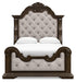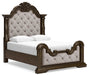 Details | B947B2: Includes upholstered panel headboard, upholstered panel footboard and panel rails, Made with hardwood solids, oak and ash swirl veneers, MDF substrates and cast resin components, Dark brown finish, Polyester upholstery with button tufting, Foundation/box spring required, sold separately, Mattress available, sold separately, Assembly required, B947B1: Includes dresser and mirror, Made with hardwood solids, oak and ash swirl veneers, MDF substrates and cast resin components, Dark brown finish, 6 smooth-gliding drawers with dovetail construction (top drawer felt lined), Drawer pulls with antiqued goldtone finish, Mirror attaches to back of dresser, B947-46: Made with hardwood solids, oak and ash swirl veneers, MDF substrates and cast resin components, Dark brown finish, 5 smooth-gliding drawers with dovetail construction (top drawer felt lined), Drawer pulls with antiqued goldtone finish, | |