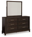 Details B618B2: Includes upholstered panel headboard, panel rails and panel footboard with slats, Made with hardwood solids, engineered wood and MDF substrates, Grayish brown wood-tone finish, Floating inset upholstered panel in polyester Next-Gen Nuvella fabric surrounded by LED backlight, Next-Gen Nuvella™ is a performance fabric that is soft, easy to clean, stain-resistant and durable, Clean fabric with mild soap and water, let air dry; for stubborn stains, use a solution of 4 oz. bleach to 28 oz. water, Light switch is located on each side of headboard and includes dual USB charging port (USB-A and USB-C), Power cord included; UL Listed, Foundation/box spring required, sold separately, Mattress available, sold separately, Assembly required, B618B1: Includes dresser and mirror, Made with hardwood solids, engineered wood and MDF substrates, Grayish brown wood-tone finish, Metal bar pulls with satin nickel-tone finish, 6 smooth-gliding drawers with dovetail construction and heavy duty ball-bearing side glides (top drawers felt lined), Mirror attaches to back of dresser, B618-46: Made with hardwood solids, engineered wood and MDF substrates, Grayish brown wood-tone finish, Metal bar pulls with satin nickel-tone finish, 5 smooth-gliding drawers with dovetail construction and heavy duty ball-bearing side glides (top drawers felt lined),