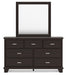 Details | B441B2: Includes panel headboard, footboard, rails and slats, Made with hardwood solids, engineered wood veneer and MDF substrates, Dark brown finish, Floating panel headboard, Picture frame footboard, Foundation/box spring required, sold separately , Mattress available, sold separately, Assembly required, B441B1: Includes dresser and mirror, Made with hardwood solids, engineered wood veneer and MDF substrates, Dark brown finish, Metal bar pulls with bright nickel-tone finish, 7 smooth-gliding drawers with dovetail construction and metal center guides, Drawer interiors are lined with a wood grain laminate for a clean, finished look, Top moulding on dresser, Mirror attaches to back of dresser, | |