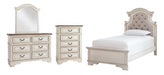 Details | B743B12: Made of veneers, wood and engineered wood, with cast resin components, Antiqued two-tone finish, 6 smooth-gliding drawers with dovetail construction, Dark bronze-tone hardware, Mirror attaches to back of dresser, Assembly required, Includes tipover restraint device, B743B13: Made of veneers, wood and engineered wood, with cast resin components, Includes upholstered headboard, footboard and rails, Distressed, chipped white finish, Upholstered headboard with foam cushion, button tufting, Assembly required, Mattress and foundation/box spring available, sold separately, Bed is compatible with an adjustable base, B743-45: Made of veneers, wood and engineered wood, with cast resin components, Antiqued two-tone finish, 5 smooth-gliding drawers with dovetail construction (top drawer felt lined), Dark bronze-tone hardware, | |