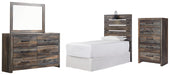 Details | B211-53: Hardware not included, Made of engineered wood (MDF/particleboard) and decorative laminate, Brown rustic finish with burnt orange and teal accents in a replicated wood grain with authentic touch, Decorative sconce light, LED with 3 AA batteries, 2 slim-profile USB charging stations, Power cord included; UL Listed, ¼" bolts are needed to attach headboard to existing bed frame, Bolt length depends on thickness of your bed frame, Assembly required, B211-46: Made of engineered wood (MDF/particleboard) and decorative laminate, Brown rustic finish with burnt orange and teal accents in a replicated wood grain with authentic touch, Large-scale hardware with dark finish, 5 smooth-gliding drawers, Drawer interiors are lined with a faux linen laminate for a clean, finished look, Includes tipover restraint device, Small Space Solution, Safety is a top priority, clothing storage units are designed to meet the most current standard for stability, ASTM F 2057 (ASTM International), Drawers extend out to accommodate maximum access to drawer interior while maintaining safety, B211B1: Made of engineered wood (MDF/particleboard) and decorative laminate, Brown rustic finish with burnt orange and teal accents in a replicated wood grain with authentic touch, 6 smooth-gliding drawers, Drawers lined with faux linen laminate, Dark-tone industrial hardware, Mirror attaches to back of dresser, Assembly required, Includes tipover restraint device, | |